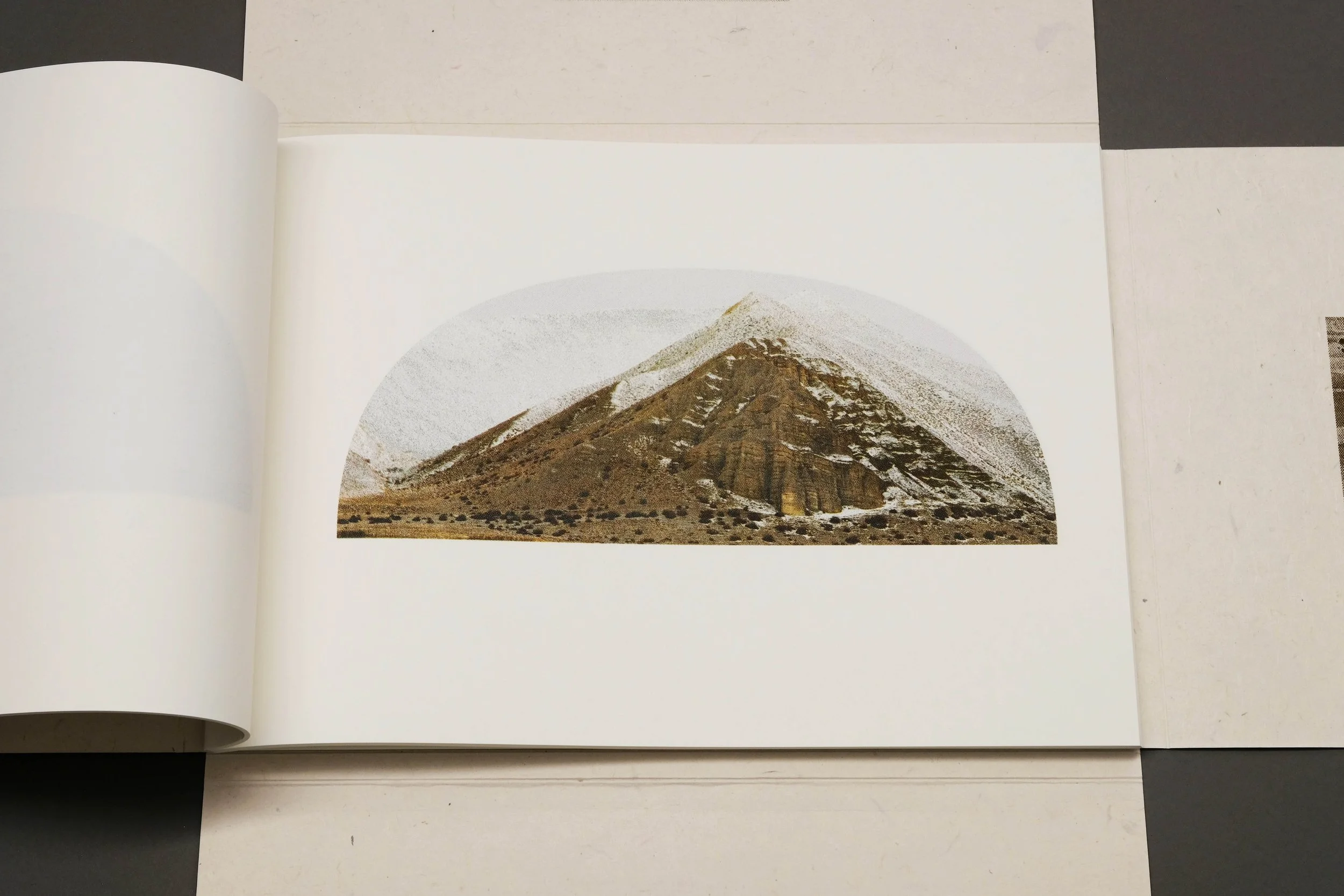 約15年前から抱いてきた仏教の原点への関心に加え、少年時代の日課であった早朝登山——自然と静かに交感する身体感覚——が、この土地での体験と重なり合いました。帰国後現像したプリントを見返すなかで、津田はムスタンで感じた身体の浮遊感を思い出します。そして「風景に四角は必要か」という問いに行き着き、宇宙船のキューポラ、逆さにしたバカラの杯のイメージと響き合う、半球型のフォーマットへと至ります。